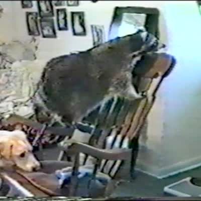 A man in a cabin tries to climb up the rocks that decorate the fireplace but one rock comes loose and he falls.