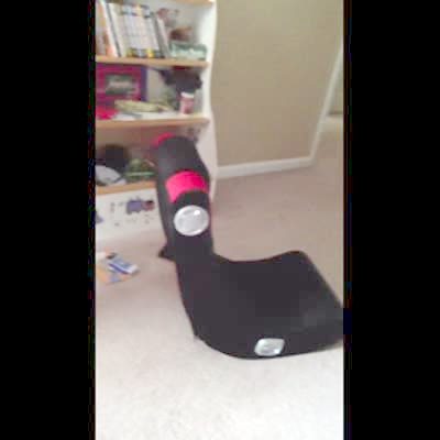 A teen girl rolls into a room on a chair before the chair rocks and hits her in the face.