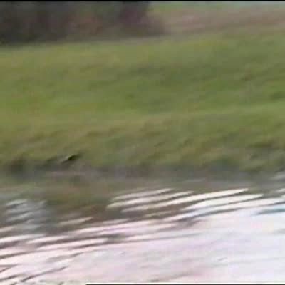 A man catches a fish in a pond, then an alligator walks up out of the water and eats the man's fish, eventually dragging the fishing pole in the water when the man tries to get it back.