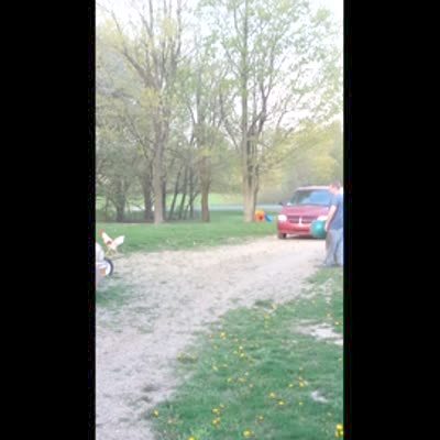 Tot boy is being chased by chicken. Boy starts to cry.