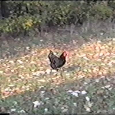 Chicken holds its head perfectly still while kid moves its body to make it look like chicken is dancing. Rooster. Chicken Dance music is married to the clip. Odd.