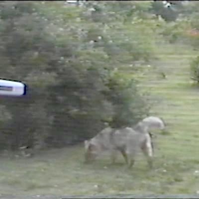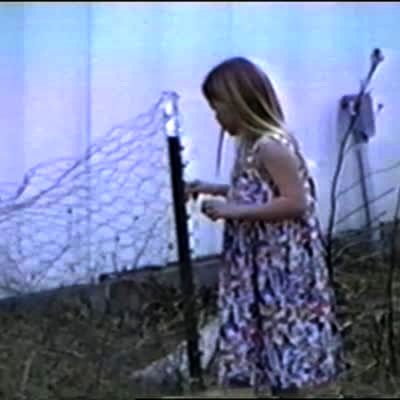 A rooster bird bites at a young girl's ankles, then it chases her around a yard until a dog tackles the rooster. No sound. Security camera footage. Multiple angles.