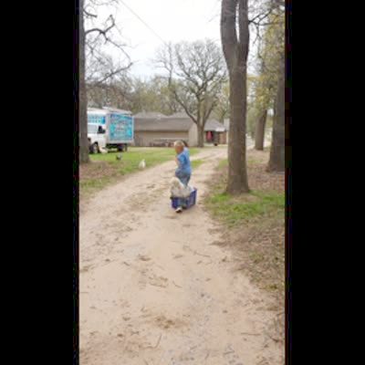 A teen girl on a farm rides an ATV and screams as a chicken jump on. She feeds them, then runs away. She drives by again and throws another bowl of food. Security Footage.