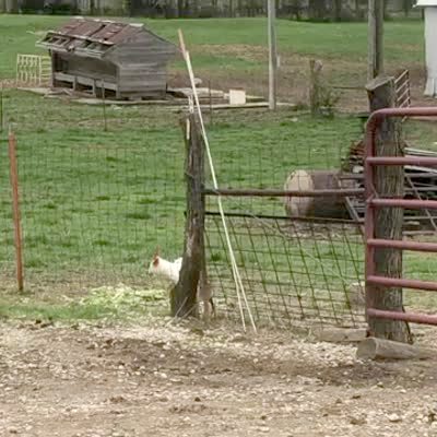 A rooster bird in a driveway crows around 0:12 and a cat in a yard runs up behind them and scares the rooster and it jumps in the air.