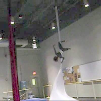 A woman hits her head on the floor practicing a silk rope routine in a gym. Short tail.