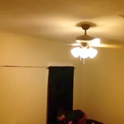 Teen boy throws a ball into a ceiling fan. It comes back and hits him in face.