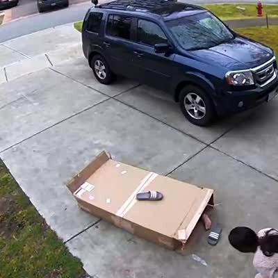 A teen girl falls and loses her sandals when she tries to stand inside a large box in the driveway.
