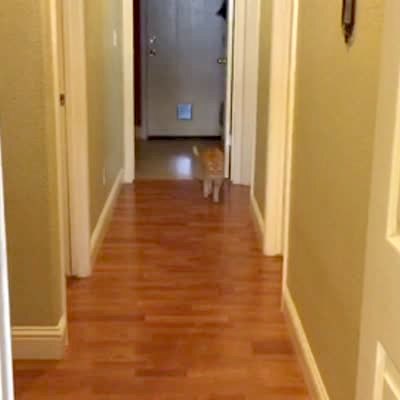 A cat walks down a hallway indoors when a man jumps out in front of it and screams to scare the cat away.