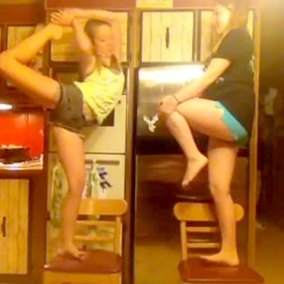 A teen girl tries to pull her leg up to her head while standing on a chair at home and falls.