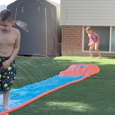 A young girl goes down an inflatable water slide in the backyard and flips over the barrier and folds in half and shouts "ow!"