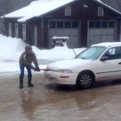 A man scrapes snow and ice from his driveway outdoors before he slips away uncontrollably.