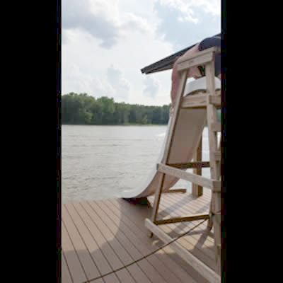 A man tries to slide into a lake but his stomach scrapes on the slide and stops him then he climbs to the bottom and jumps in