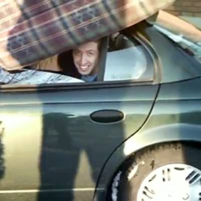 A young man wearing a brown jacket outdoors tries to wipe ice off of a car but keeps sliding away.