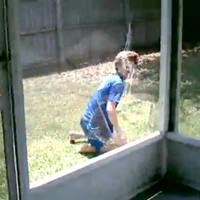 Teen boy jumps through a window screen on purpose and lands in the yard.