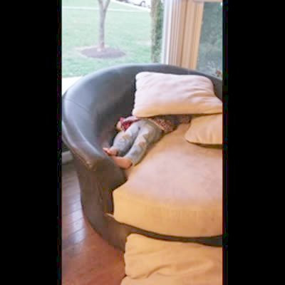 A tot girl hides under a pillow on a couch, but her legs can be seen. Her mom asks her if she is in various locations and she says no and talks to her mom.