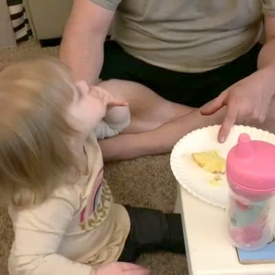 A tot girl sits and waits with two dogs to get a treat in the dining room, but one dog takes all three treats off of the plates in front of them.