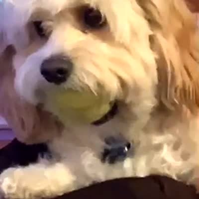 A senior woman repeatedly asks a poodle dog for the ball in its mouth. It turns its head away then shakes its head and runs out of the living room.