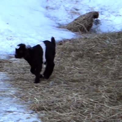 A baby goat jumps around in the snow outdoors and another baby goat falls/ face plants.