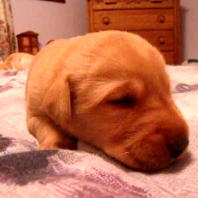 Cute puppy dog is sitting on bed. Shooter says "say something," and the puppy whines.