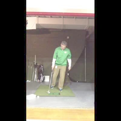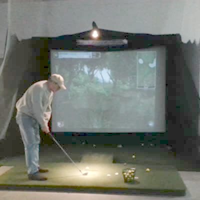 A man hits golf balls into an indoor golf simulator in a garage and the ball bounces back and hits him in the groin.