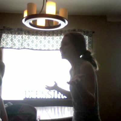 Two teen girls sing along and dance to a song, their father walks shirtless in the background.