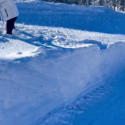 A woman sleds down a snow covered driveway and tumbles out of the sled, does a somersault and lands back into the sled before continuing down the driveway.
