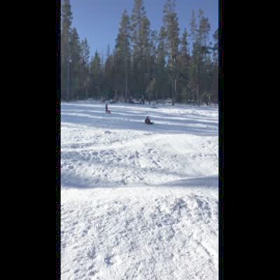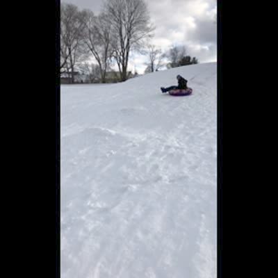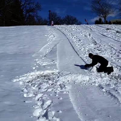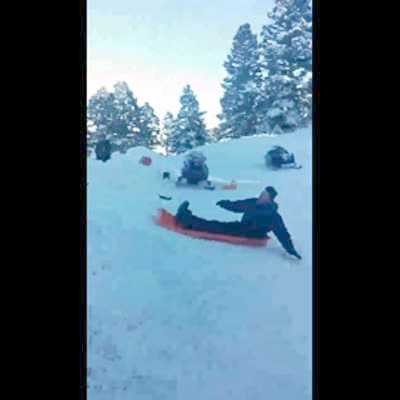 A man rides a sled over a ramp in slow motion. When he lands, he bounces off his inflatable sled and his face slides on the ground. Music added. Vine/Instagram