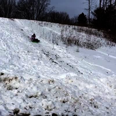 A young man crashes sledding down a snowy hill and flying over a snow bump. Short tail.