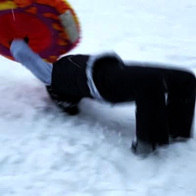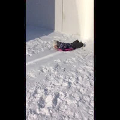 A young girl crashes in snow after sledding over a ramp on an inflatable tube.