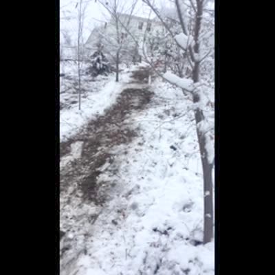 Boy shovels snow on walkway in front of house, brother sleds off ramp and lands on him. Winter. Siblings.