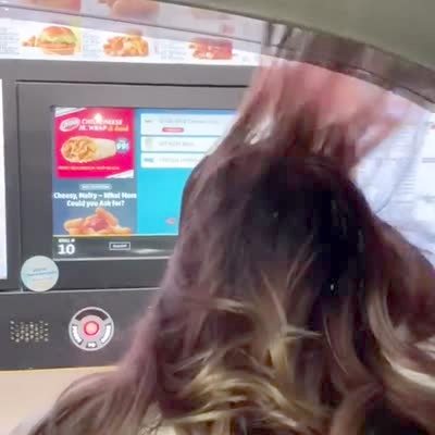 A woman's hair sticks straight up as she orders from a drive-thru in a car.