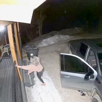A woman gets out of a car on a driveway, then slips and falls on snow when she walks up to the porch. She hits a metal railing and produces a loud sound. Security footage.