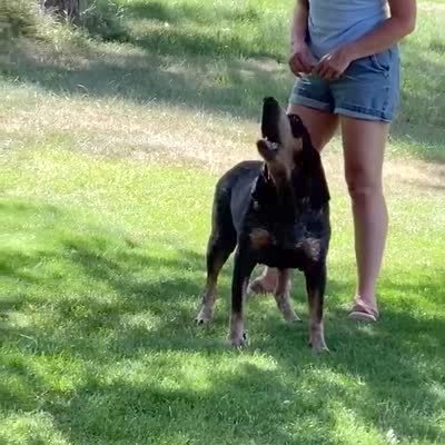A man pets a Dachsund dog who whines in a backyard, then he asks the dog "is that good loving," and the dog whines a noise that sounds like "uh-huh."
