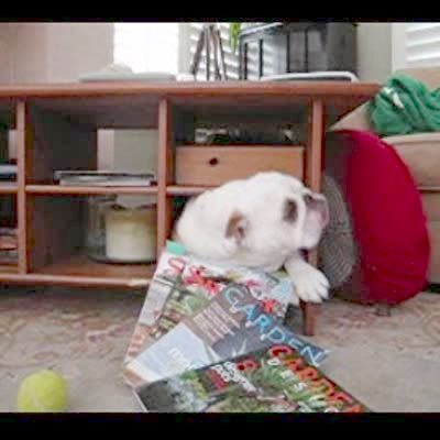 Bulldog wiggles through a small space at the bottom of a coffee table - he is stuck. Dog