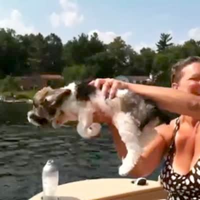 A woman holds up a dog while sitting on a moving speed boat and the dog pretends to swim, overlooking the water.