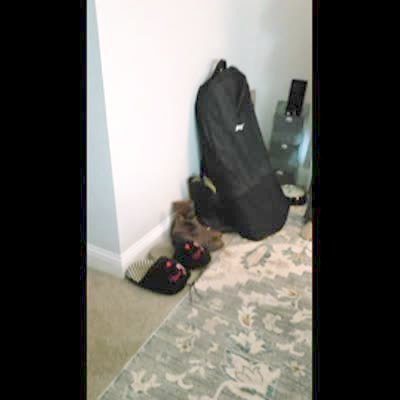 A teen girl walking out of the door notices a spider on her hand and gets scared. She screams then flies into the potter plant and says, "Oh, I'm bleeding bad" on the front porch. Security footage.
