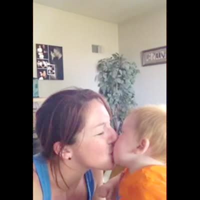 A baby boy spits up in his mother's mouth when kissing her indoors.