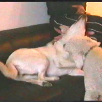 "Four-Legged Frenzy" Cat fights with Rat Terrier. Dog runs all over while cat sits in 1 spot waiting to scratch dog when it gets too close.