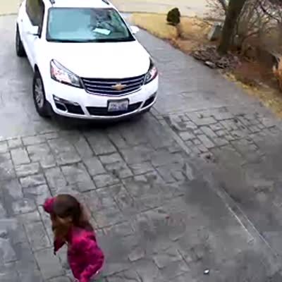 A young girl rides a toy car outside. A woman asks her, "Are you going to parallel park?" The daughter then parallel parks between a SUV and a truck but it's actually her dad off screen that drives the car with a remote controller.