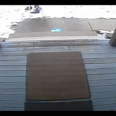 A man slips on ice and falls down when he steps off his porch. A second man slips and falls on the same spot. Security camera footage. No audio.