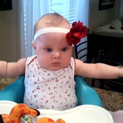 A baby girl spreads her arms, looks surprised, and drops her pacifier out of her mouth when her mom crinkles paper off screen.