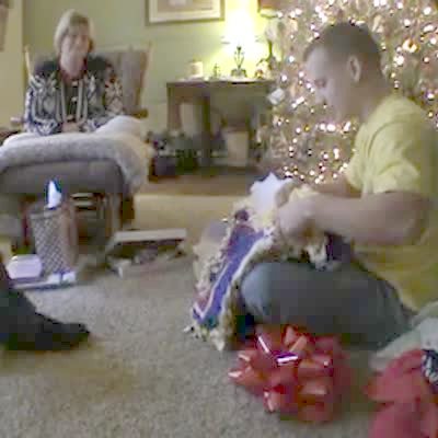 Man spreads out a blanket in the living room, suddenly the Christmas tree falls on older woman sitting in a chair.