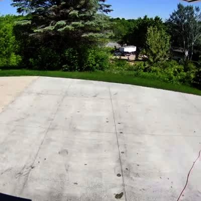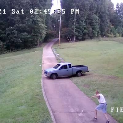 A woman tries to hold onto a boat as it rolls down a driveway, but she has to run to keep up with it and it crashes off-screen. Security footage.
