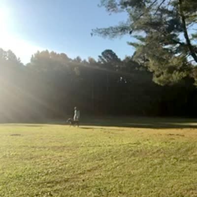 A teen girl runs through a field with a dog on a leash. The dog suddenly runs in a different direction and the girl falls when he pulls her.