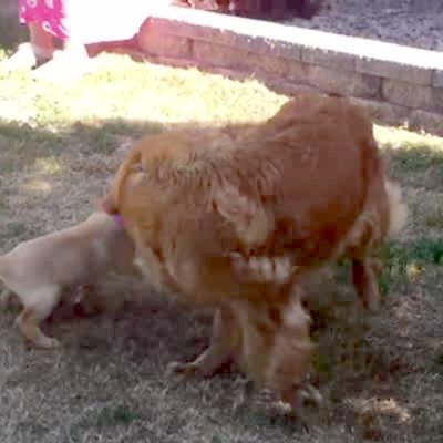 A puppy dog bites onto a dog's tail and is spun around in circles.