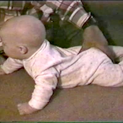 Tot boy in diapers and tennis shoes is confused by the squeaking noise his sneakers are making. His parents laugh.