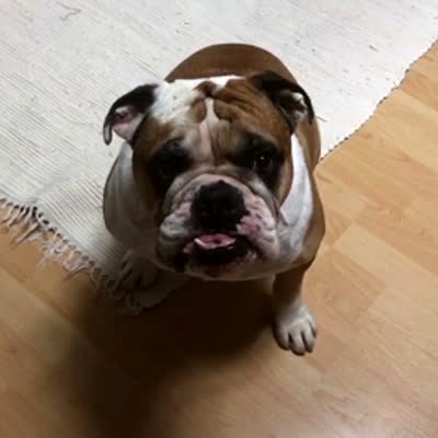 A bulldog dog licks its nose each time a toy squeaks off camera.