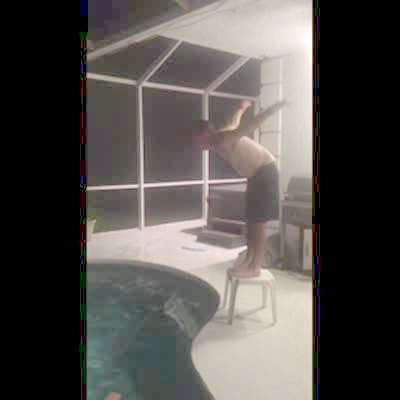 A man stands on a step stool to dive in to a swimming pool. The stool slides out from under him and he lands on the side and falls in to the pool.