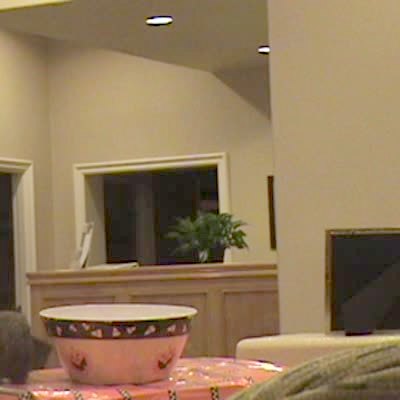 A raccoon sticks its head and one paw through an open window in a bedroom, then it pulls a bowl of cat food over to the window, and a man and woman wake up to stare at it. No audio. Security footage.