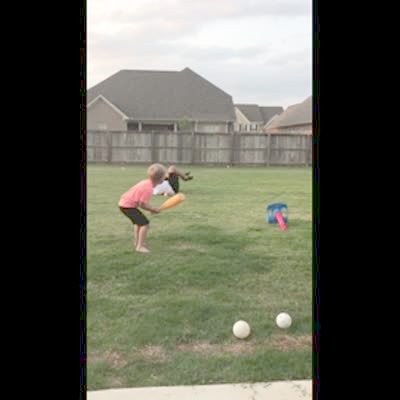A young boy and girl play catch in the street until the ball tips off the boy's glove and hits his dad who holds the camera and the dad falls down.